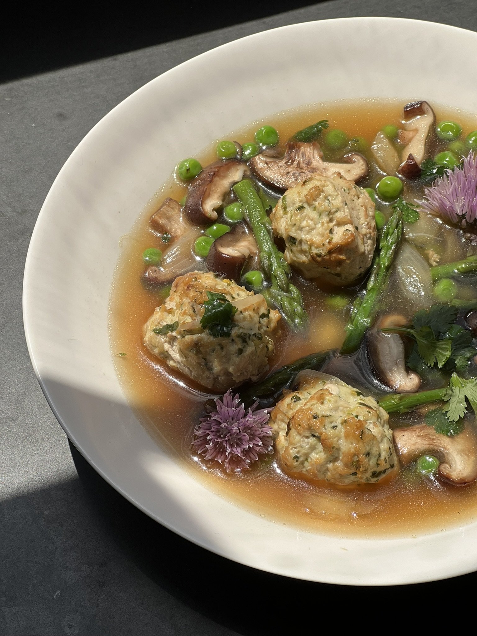 Chicken Polpette in Light Herb Broth with Spring Vegetables