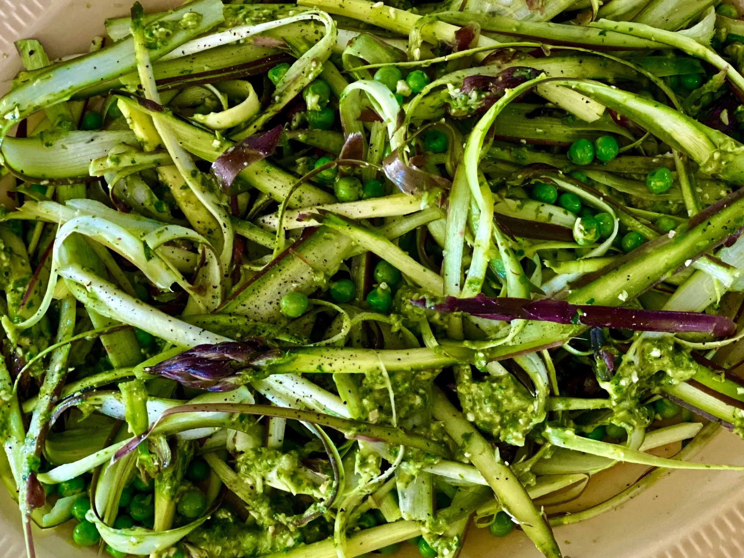Raw Shaved Asparagus & Fresh Pea Salad with Walnut Pistou