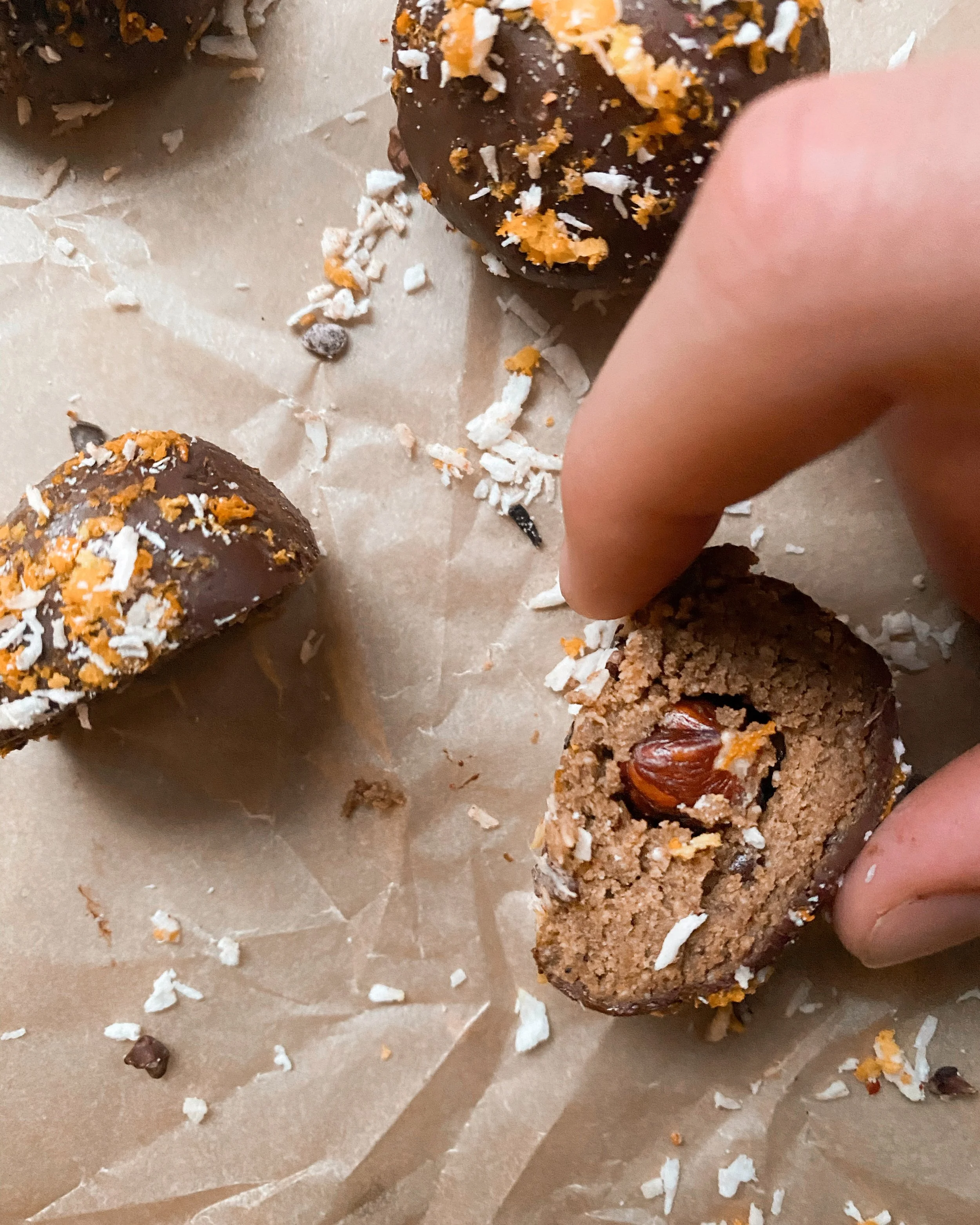 Add the seeds, dates, oil, protein powder, orange zest, and blitz until the mixture is well combined and holds its shape when rolled out.