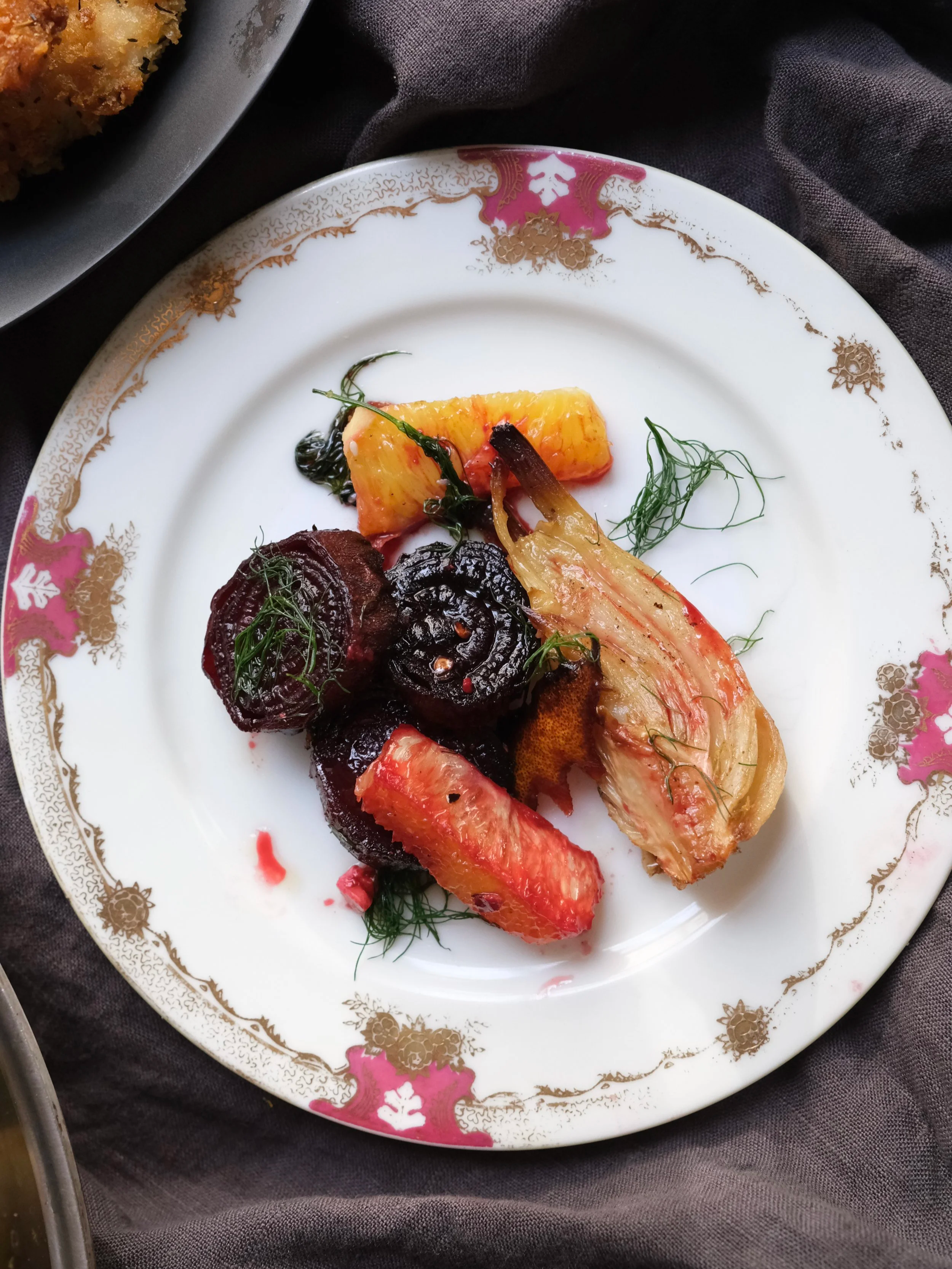 This dish uses a reverse sear on beets: first, gently steam to preserve structure and nutrients, then sear at high heat to develop caramelization. Citrus rind, bay, and honey build aromatic depth, while roasted radicchio contributes bitterness to balance sweetness and acidity. The final garnish adds freshness and texture.